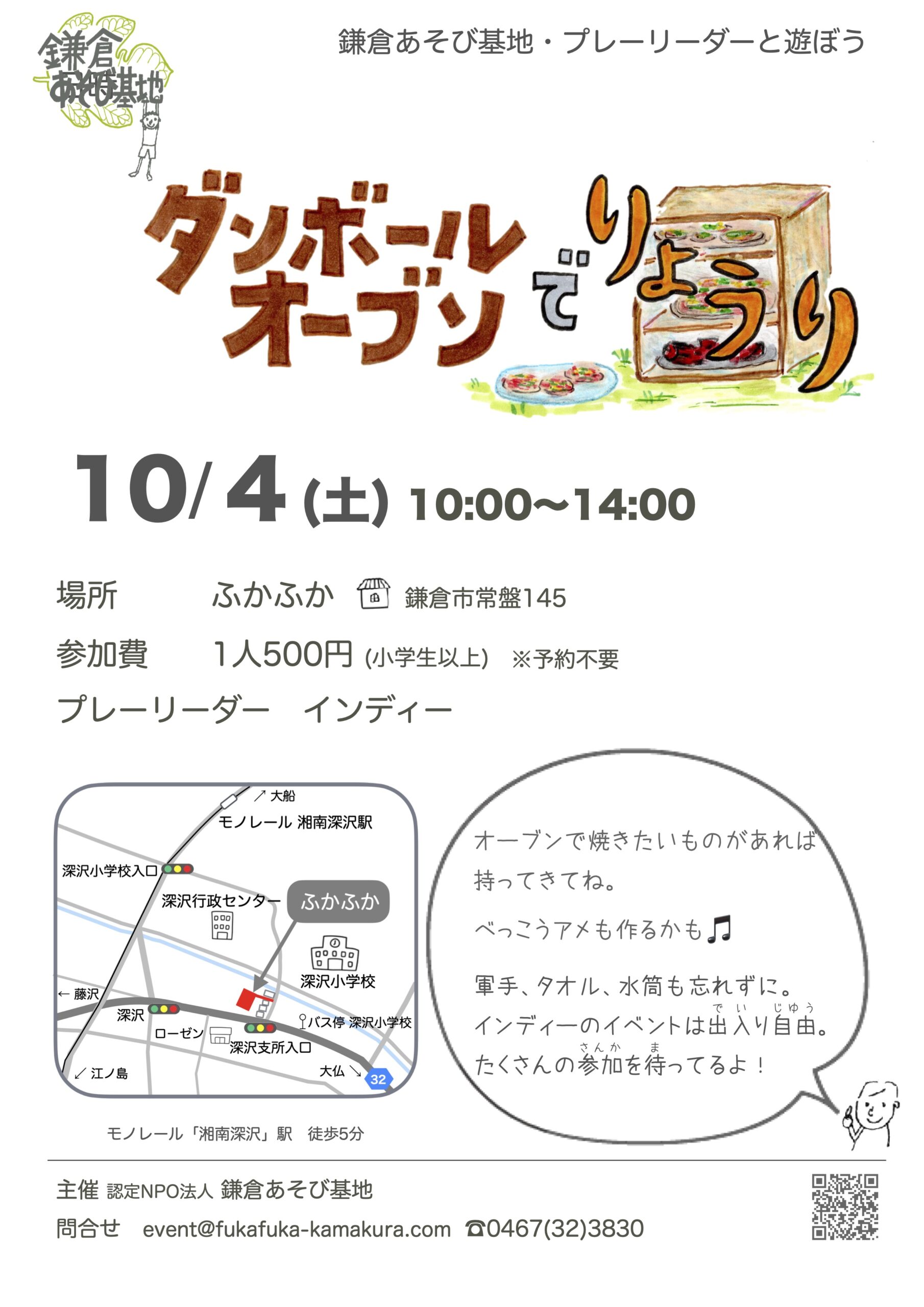 10/4(土) プレーリーダーと遊ぼう〜ダンボールオーブンで料理〜 susuga 2025/9/26 インディー prev 10/3(金) プレーリーダーと遊ぼう〜ダンボールオーブンで料理〜 next 10/30(木)平日昼間の地域食堂 日時 :10/4(土)10:00-12:30 出入り自由 場所 :ふかふか 常盤145 深沢小学校徒歩1分 参加費:小学生以上500円(付き添いの保護者の方は無料です)、予約不要 プレーリーダー:インディー 関連記事: 10/3(金) プレーリーダーと遊ぼう〜ダンボールオーブンで料理〜 5/10(土) プレーリーダーと遊ぼう〜竹でごはん〜 6/7(土) プレーリーダーと遊ぼう〜ダンボールで剣と手裏剣〜 9/6(土) プレーリーダーと遊ぼう〜あき缶コンロでサバイバル料理〜 9/5(金) プレーリーダーと遊ぼう〜あき缶コンロでサバイバル料理〜