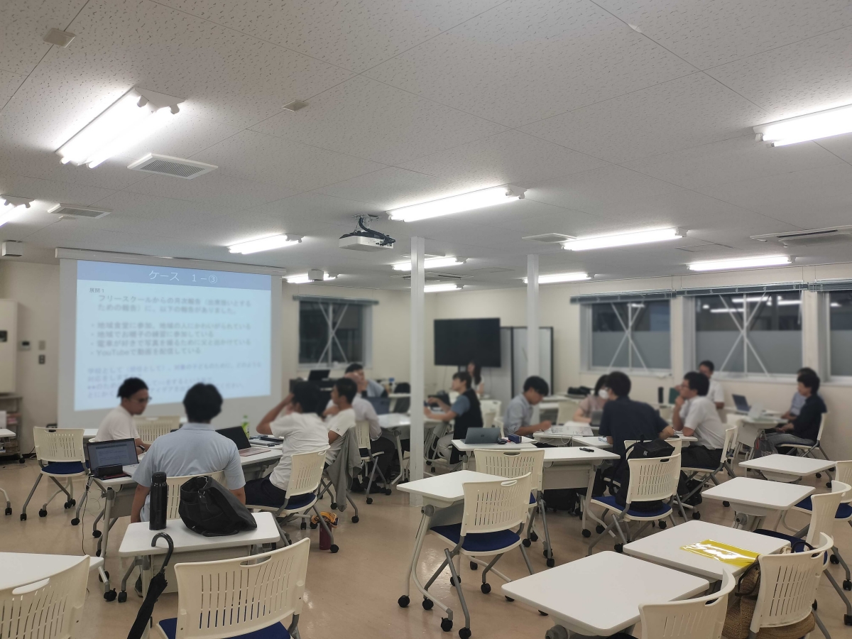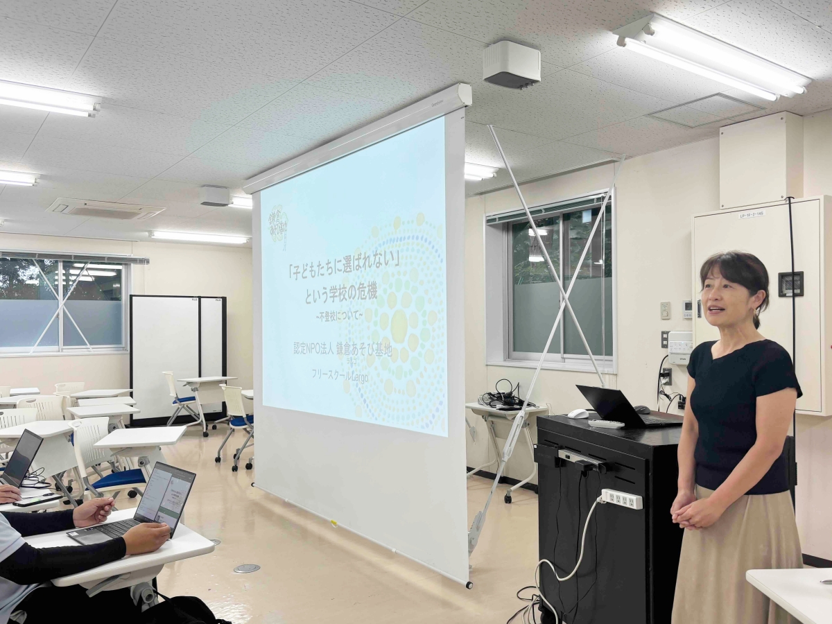 前半は、小林による実体験に基づく、不登校の子どもの学校外での多様な学びについてやフリースクールの存在意義について、後半は水澤がLargoの活動の紹介と学校・行政・地域との連携についてお話しし、グループワークで事例検討をする90分の講義でした。