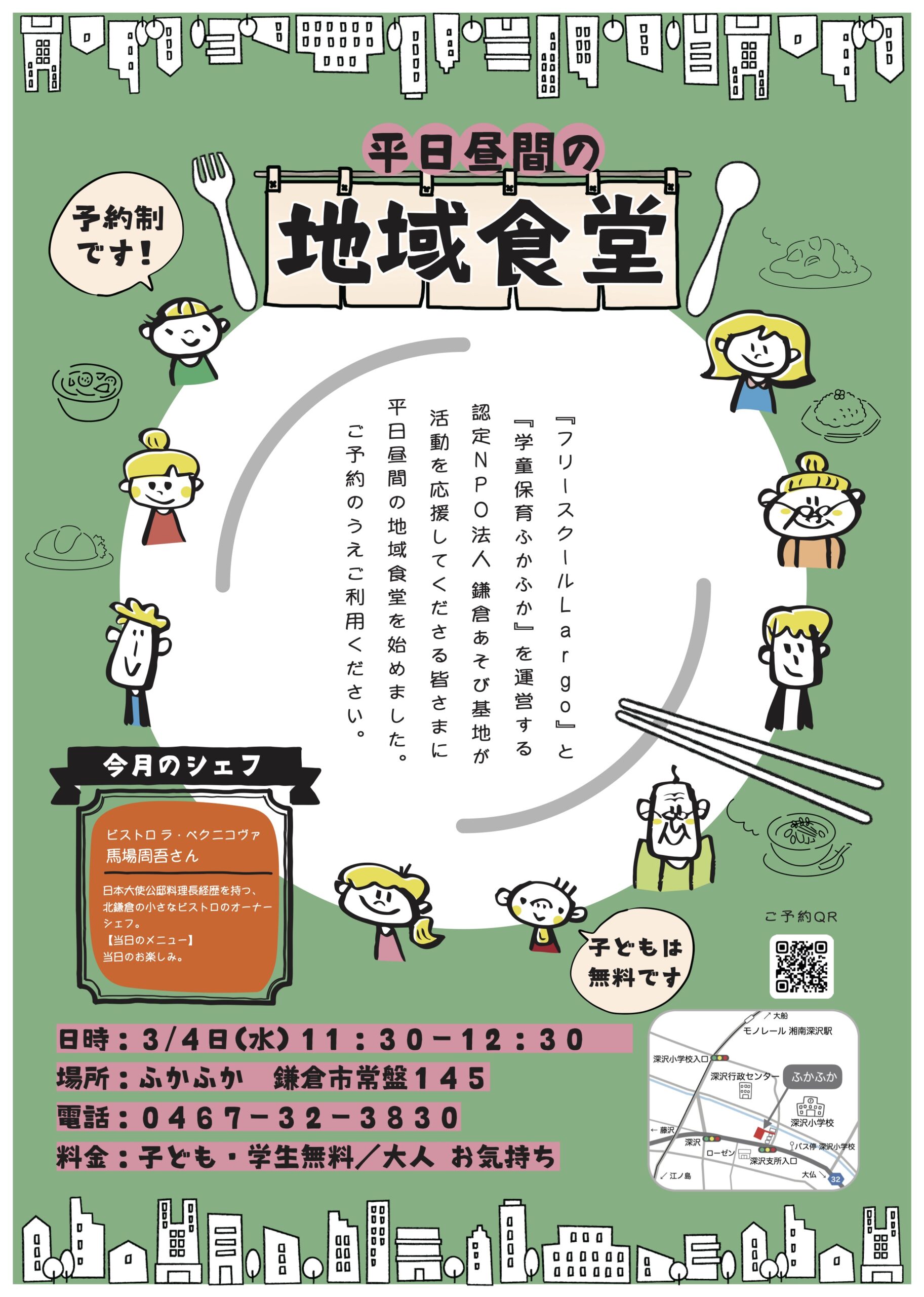 フリースクールLargoと学童保育ふかふかを運営する認定NPO法人鎌倉あそび基地の活動を応援してくださる皆さまに平日昼間の地域食堂を始めました。